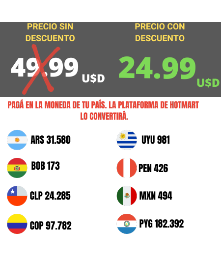 Este programa 100% online esta valuado por un monto de U$D 50, y con mensualidades de mantenimiento, pero SOLO POR EL DÍA DE HOY queremos darte un DESCUENTO DEL 50% y el ACCESO PARA TODA LA VIDA, sin mensualidades ni pagos adicionales. ¿ESTÁS LISTO PARA TRANSFORMAR TU VIDA?